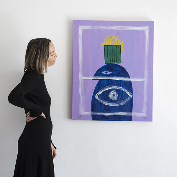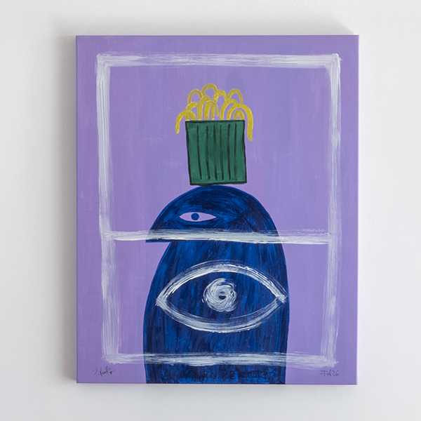 La obra que cierra el ciclo introspectivo. ‘En el Lugar’ es una meditación sobre el espacio que habitamos internamente. El fondo lila, color de la transmutación y el pensamiento elevado, acoge una figura central que custodia la visión interior. La superposición de formas y la ventana simbólica blanca crean una profundidad que trasciende el plano físico.